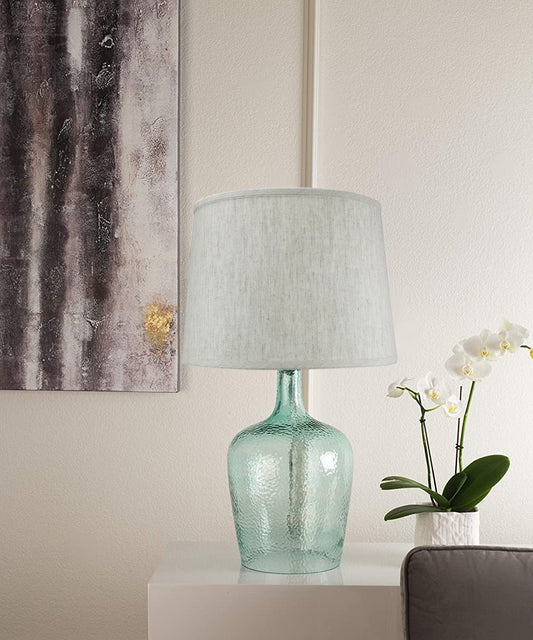 19"h Artisanal Hand-Blown Aqua Green Sea Glass Coastal Style Table Lamp, White Linen Drum Shade